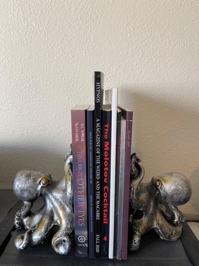 I’d planned to revise and submit 16 short stories. I’ve finished 8. Those, along with a few stories that were completed the year before, plus a few poems were submitted 71 times. My goal was 100 rejections and a few acceptances. Didn’t quite hit the rejection mark, but my short story “Wolf’s Bane” and two poems, “Haunted Basin” and “Witch’s Garden”, were accepted to publications I’m honored to have work in.