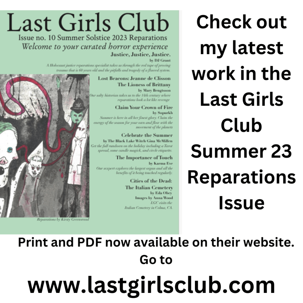 I’m thrilled to announce the inclusion of my short story “Legends of the Deep” in the latest issue of Last Girls Club. I absolutely love what they’re doing with feminist horror. “Legends of the Deep” is a dark and twisted siren story about reclaiming our stories and our voice. Please grab a copy and enjoy!